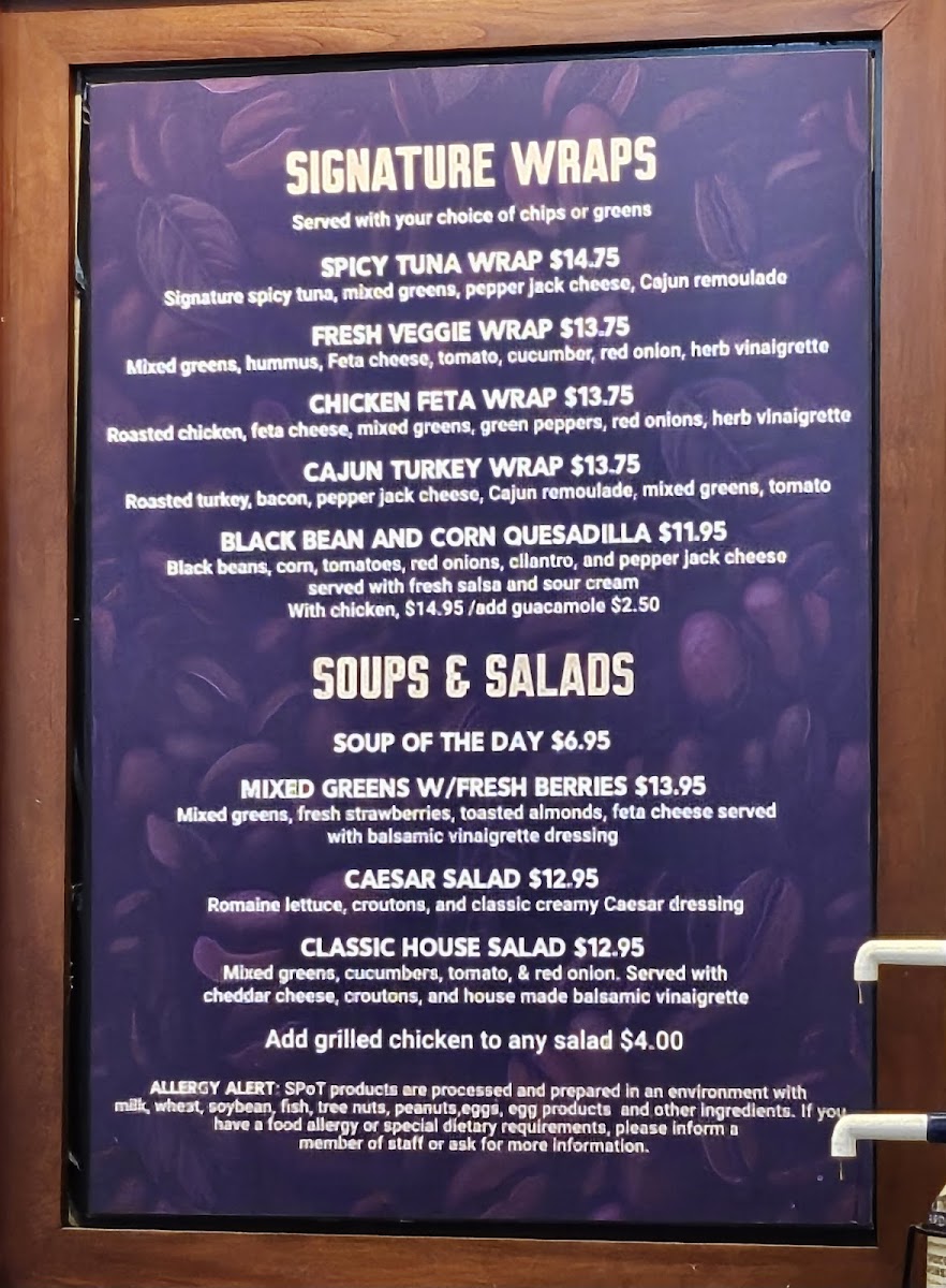 Spot Coffee's menu is a delightful blend of savory and sweet options. Start your day with their Egg & Cheese Muffin for just $3.95 or indulge in a hearty Sausage, Bacon, and Cheese Breakfast Wrap priced at $4.95. Their selection of wraps includes the Spicy Tuna Wrap and Chicken Feta Wrap, both bursting with flavor, ranging from $15.15 to $16.25.